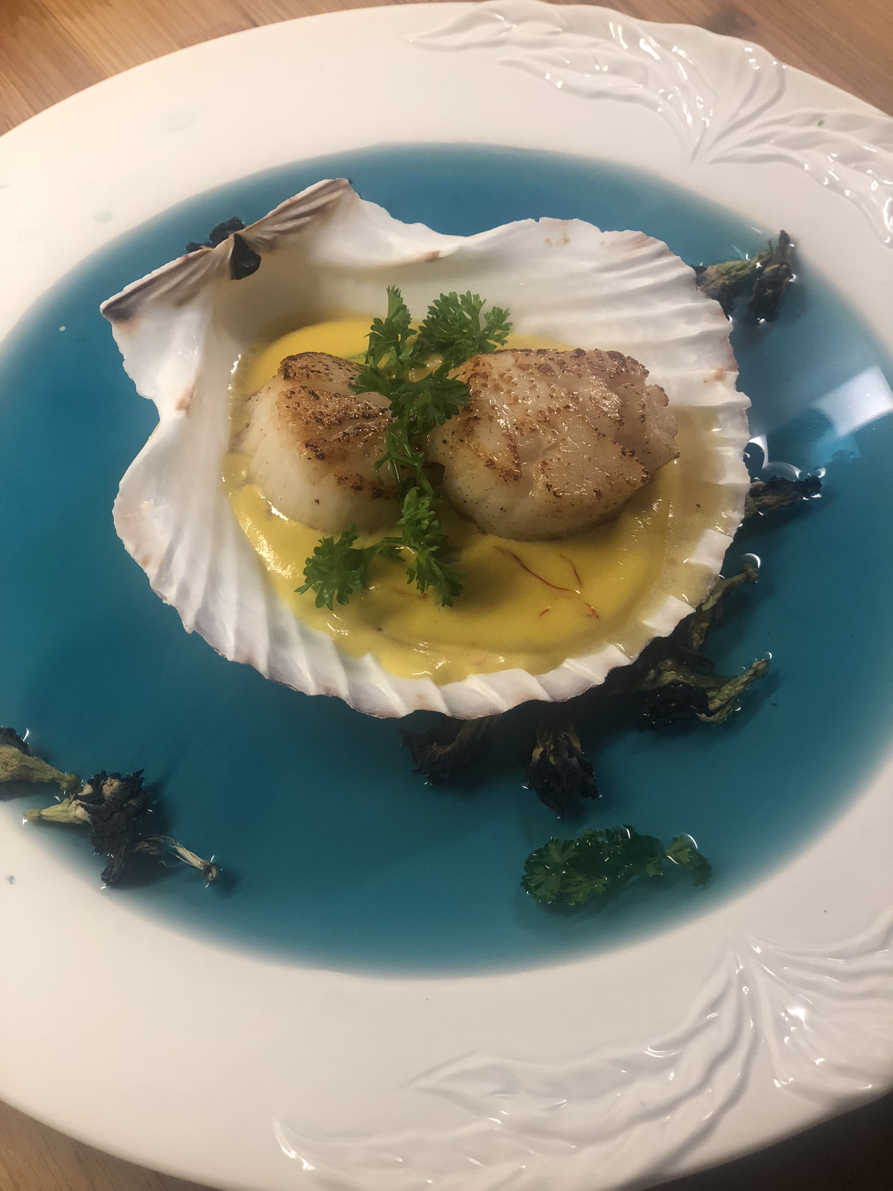 Jakobsmuschel scharf anbraten ca. 1.5-2 Min je Seite so das sie noch glasig sind innen.