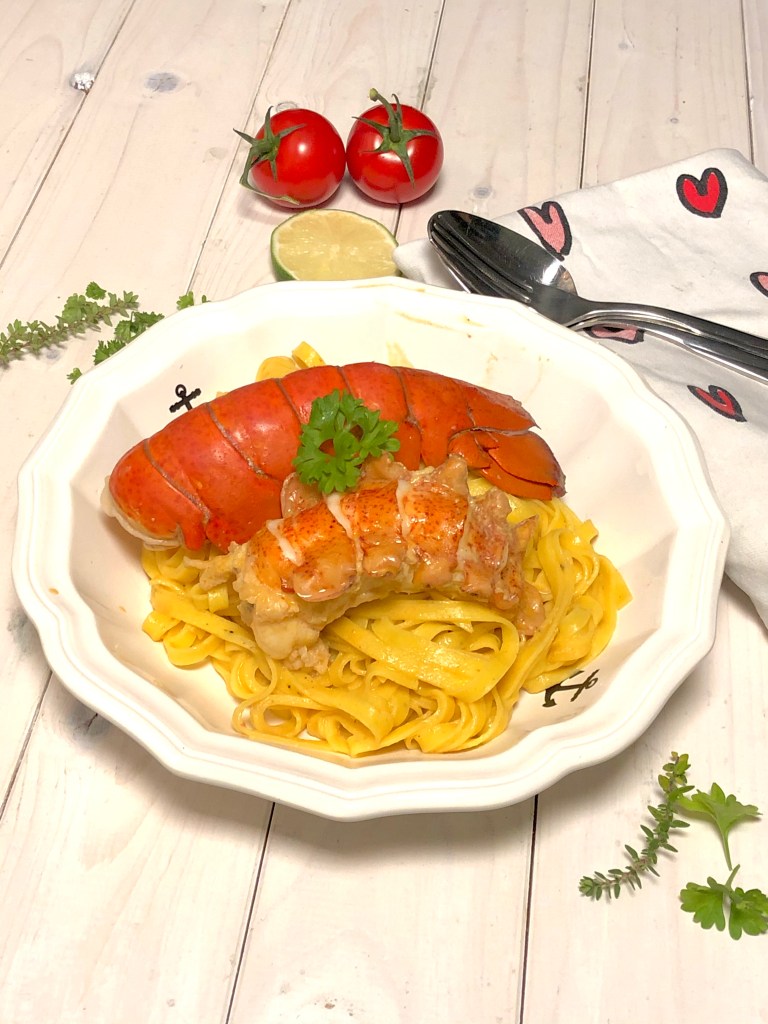 Das Fleisch herausnehmen, gekochte Trüffel-Tagliatelle dazugeben, mischen und den Teller mit dem Schwanz auf den Nudeln anrichten… mit Petersilie verzieren 🦞😍🤩🤤